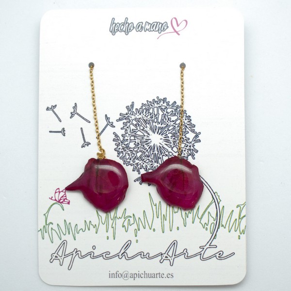 Pendientes colgantes de pétalos reales de buganvilla natural hechos con mucho mimo y dedicación. Cómodos de llevar y muy festivos.